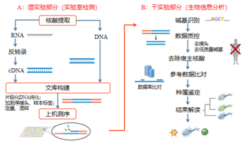 醫學檢驗中采集病原微生物用于mNGS的樣本樣本類型主要有靜脈血、腦脊液、肺泡灌洗液、痰液、胸水和腹水、咽部分泌物、局灶穿刺物、組織等多種類型。mNGS的檢測流程可以大致分為5個步驟:核酸提取、文庫構建、上機測序、生信分析與報告解讀。對病原微生物進行測序前處理過程中關鍵的一步就是核酸提取,因為病原微生物核酸提取效果的好壞,會直接影響到后續測序的成敗。