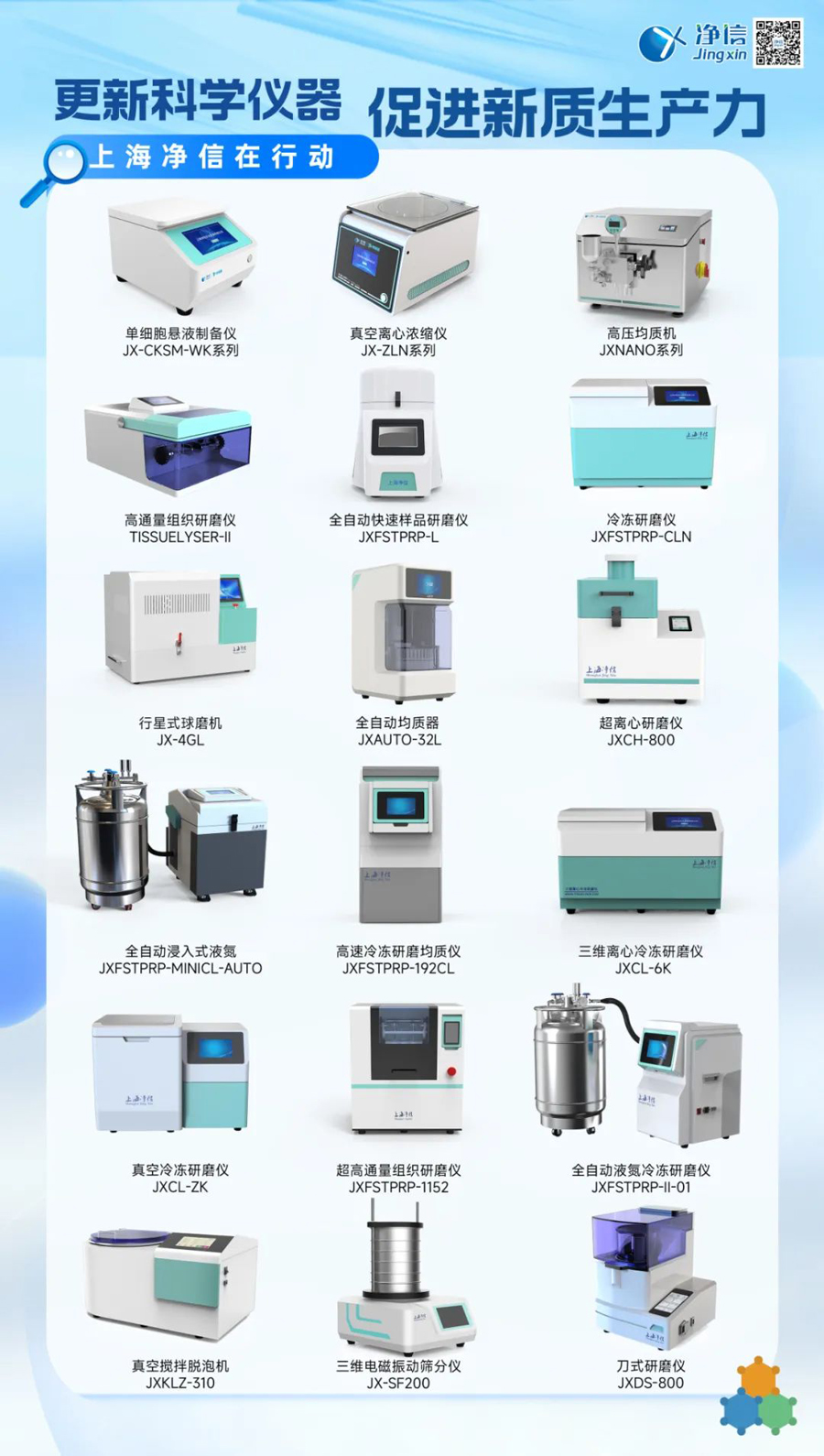 在國家大規模設備以舊換新的政策推動下,上海凈信積極響應,推出了一系列優質的實驗室前處理設備,助力科研工作者提升實驗效率,推動科研創新。上海凈信的實驗室前處理設備涵蓋了樣品破碎、混合、分散、均質化等多個環節,能夠滿足不同實驗室的多樣化需求。