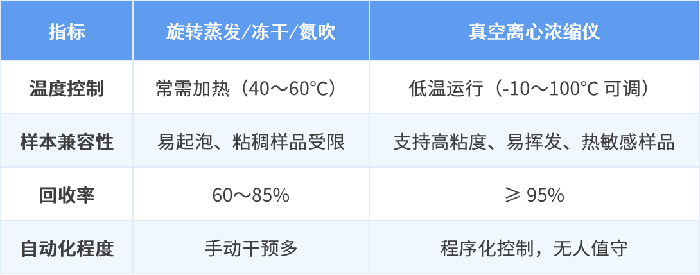 傳統方法與真空離心濃縮儀在多個維度的表現對比