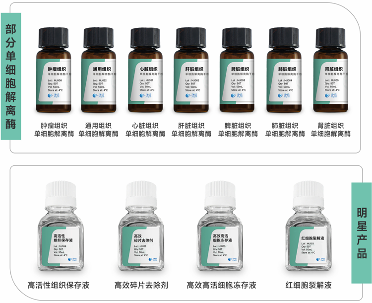 產品簡介:上海凈信推出了一系列針對不同組織的特異性單細胞解離酶,專為高質量單細胞懸液制備而設計。產品采用了高純度、多元化酶配方,可快速、溫和解離組織樣本,最大限度保持細胞活性和完整性,適用于各類原代細胞提取、培養、流式分析、類器官、腫瘤組織解離及單細胞測序等研究。